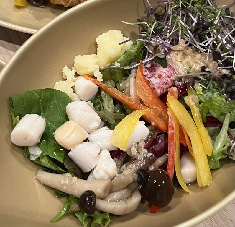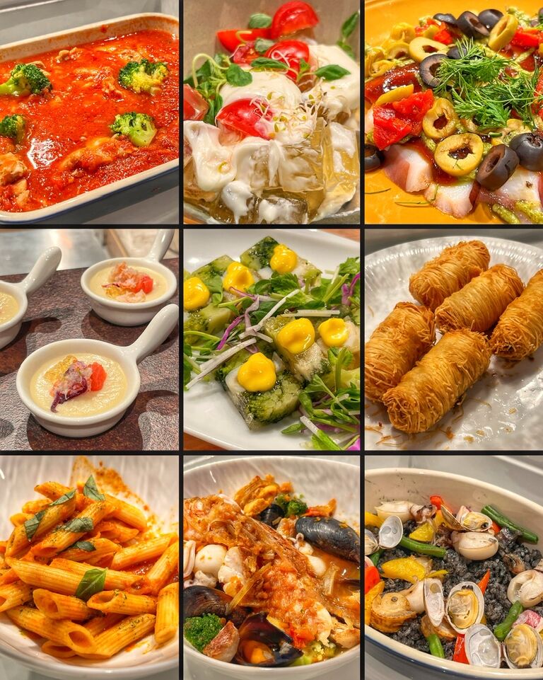お料理は、ハーブやオリーブオイルを使った南欧風のものに加えて、シーフードプラッターや海鮮丼、フカヒレラーメンなどの豪華なメニューも合わせて28品。
