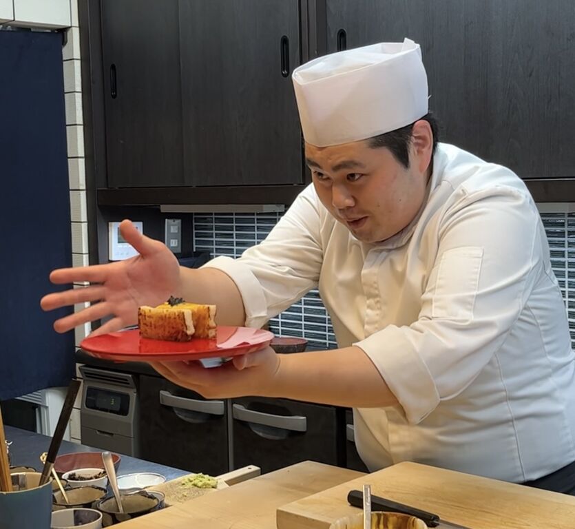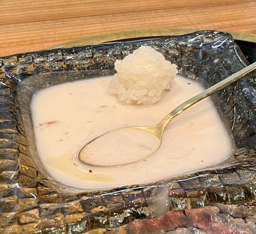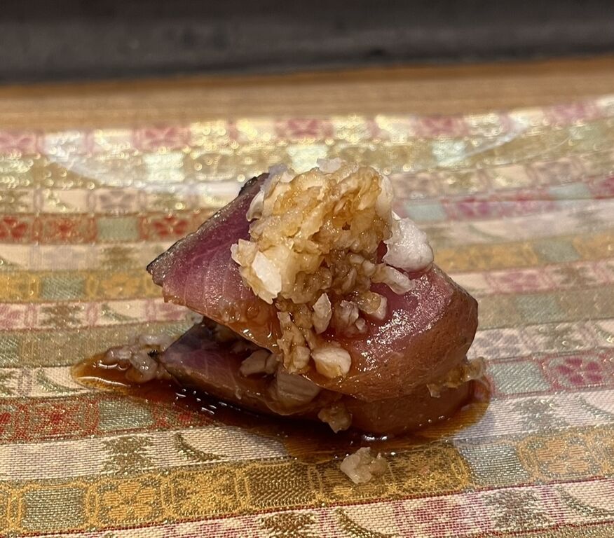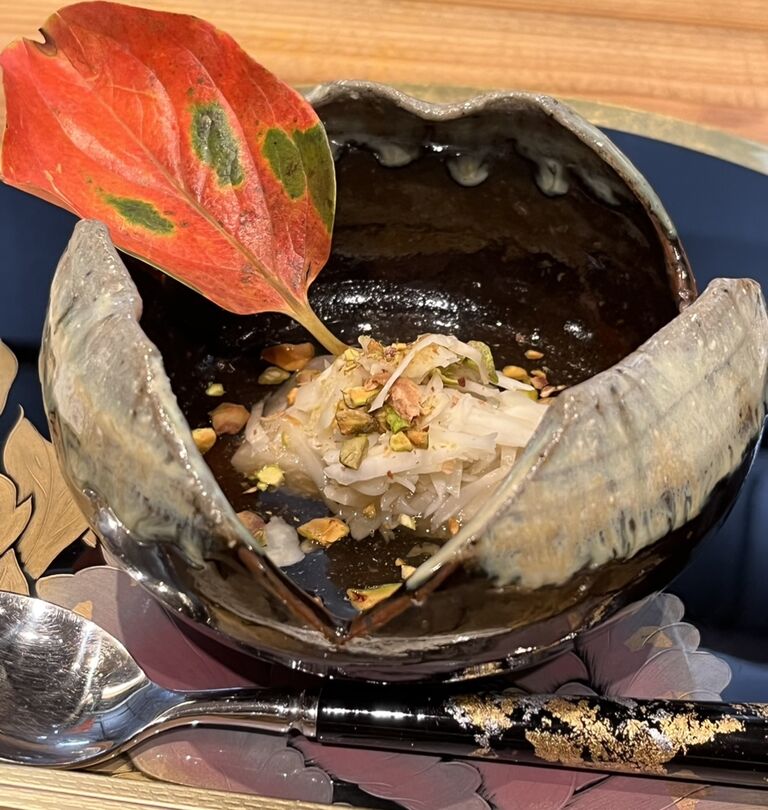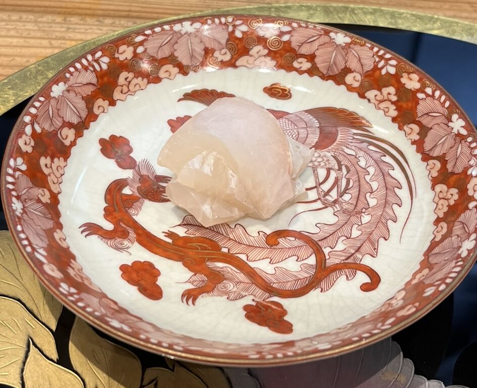 五島列島でとれた15㎏ものの九絵(クエ)を4日間熟成させ、1日間昆布締めにしたものは、ぶりぶりとした弾力と歯ごたえがすばらしい。舌に当たる昆布の風味が九絵の旨味と重なって、もうこれだけでもおいしいのだけれど、