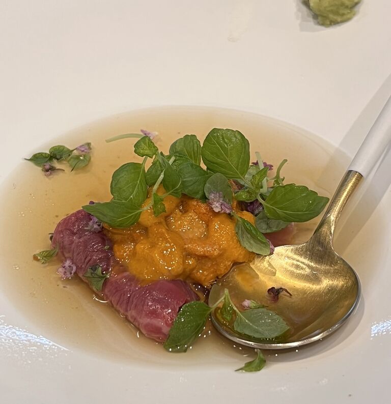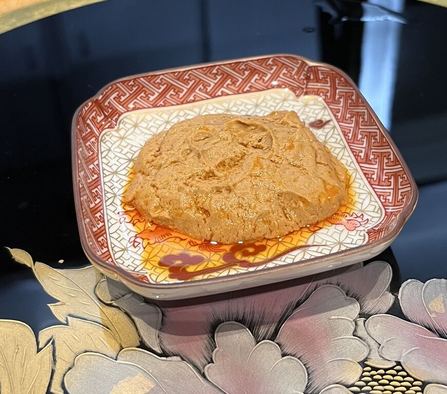 北海道産の塩水雲丹をまとわせていただくと、お肉も雲丹もぷるんぷるんでうっとりする美味しさ。