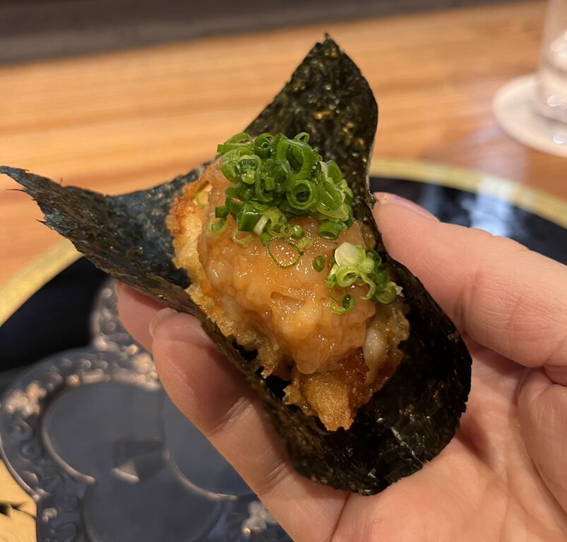 手渡しでいただいたのは、トラフグの唐揚に、福井の甘海老をたたいて味付けしたものをあわせて、海苔で巻いたもの。