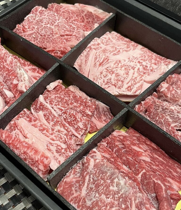 ヒレ・ロース・ウデ・肩ロース、バラ、モモの6部位が美しくケースに並んでいてステキ♡