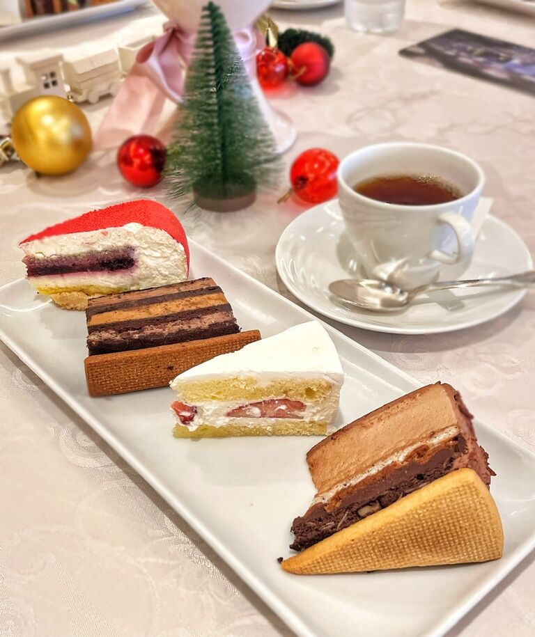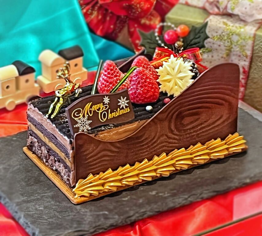 毎年人気のホテル定番のショートケーキに、大きな切り株にアッと驚くシュトーレン、ソリの形がかわいすぎるチョコレートケーキ、大きなツリーと赤が印象的なチーズケーキの4種が登場。
