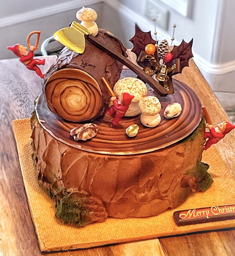 大きな切り株型のブッシュドノエルに、丸太やきのこ、きこりたちが飾られたメルヘンなデザインです。