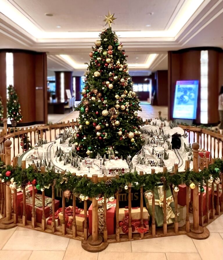 ロビーには雪景色の中のトレインのジオラマの中心にクリスマウツリーが✨✨