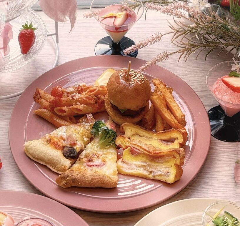 苺と三種チーズのピッツア、人気のプチサイズのバーガー、フライものなども。
