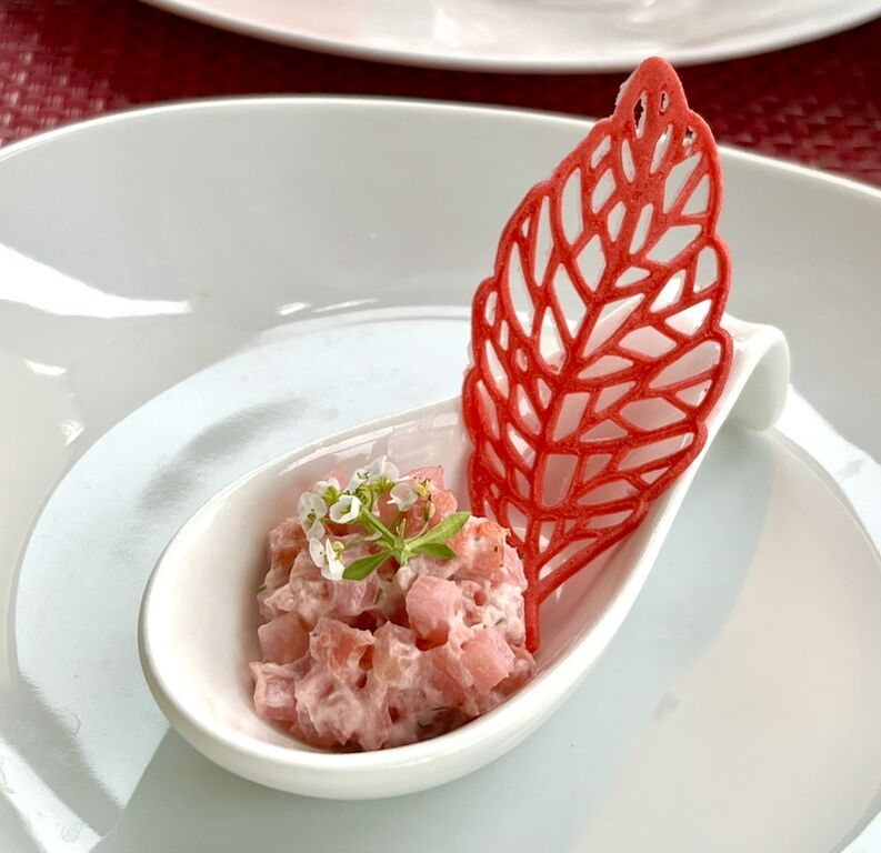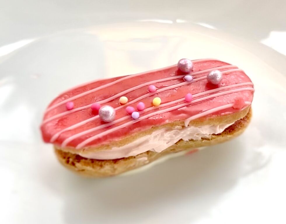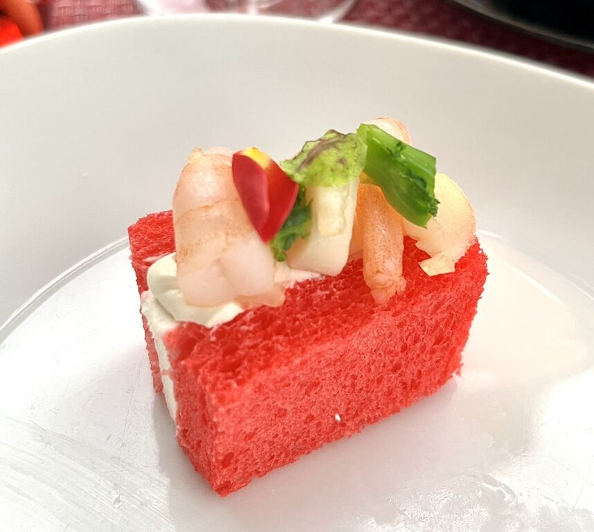 コショウがアクセントのクリームチーズをピンク色のパンでサンド。甘酸っぱいベリーのソースで一体感を表現。