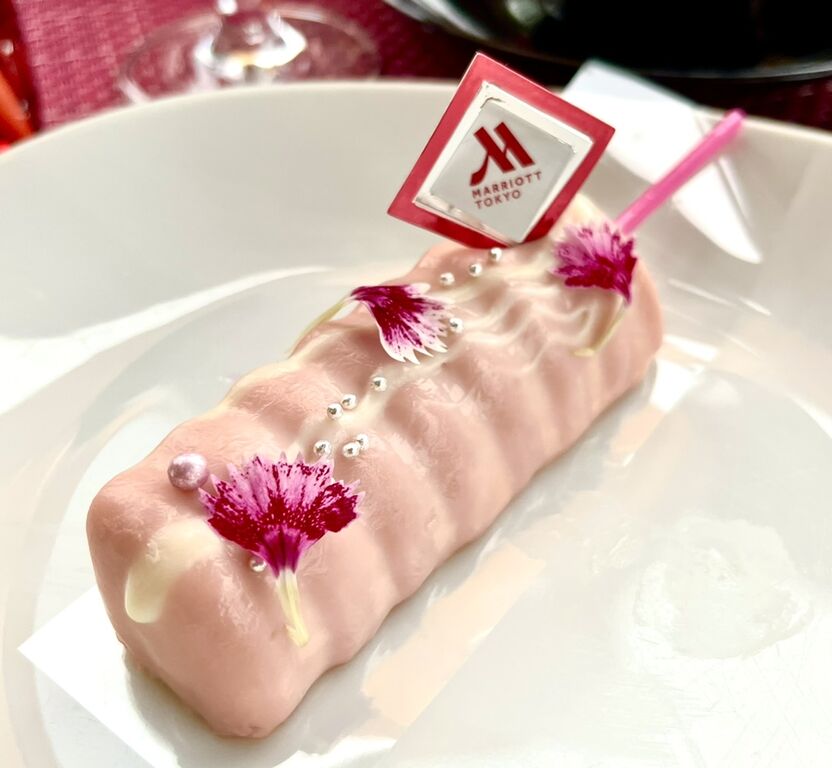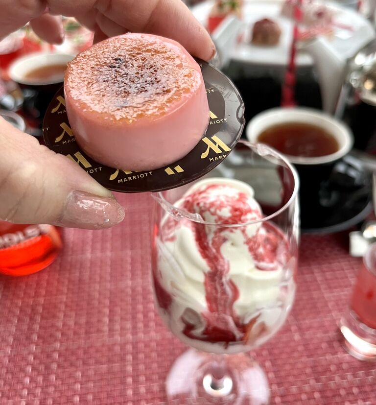 マリオットのロゴが付いたチョコレートに、キャラメリゼしたピンクのブリュレがのっていて、中にはソフトクリームやいちごが。チョコライスパフがアクセント。