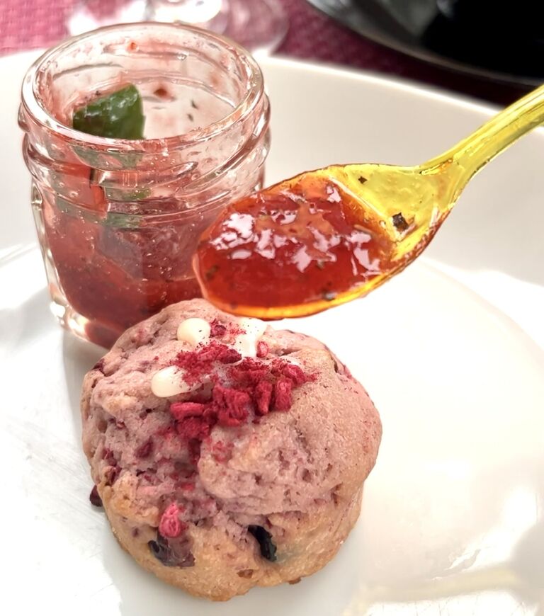 クランベリー、ラズベリー、ブルーベリーを練りこんだピンク色のスコーンに、バジルの風味をつけた苺のコンフィチュールというハイブリッド!