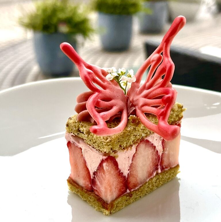 すっかりこの時期の定番となったチョコレートのチョウは、美しいピンク色。昨年より大きめで華やかです。ピスタチオの生地にイチゴクリームとフレッシュ苺。絶品♪