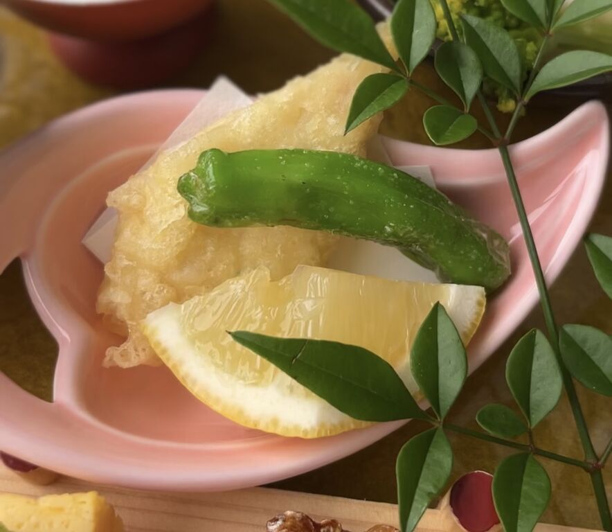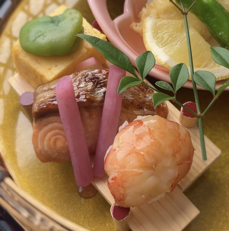 海老の手まり寿司、ふんわり柔らかい焼き鮭、厚焼き玉子に一寸豆の蜜煮。