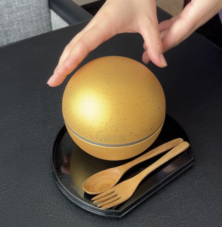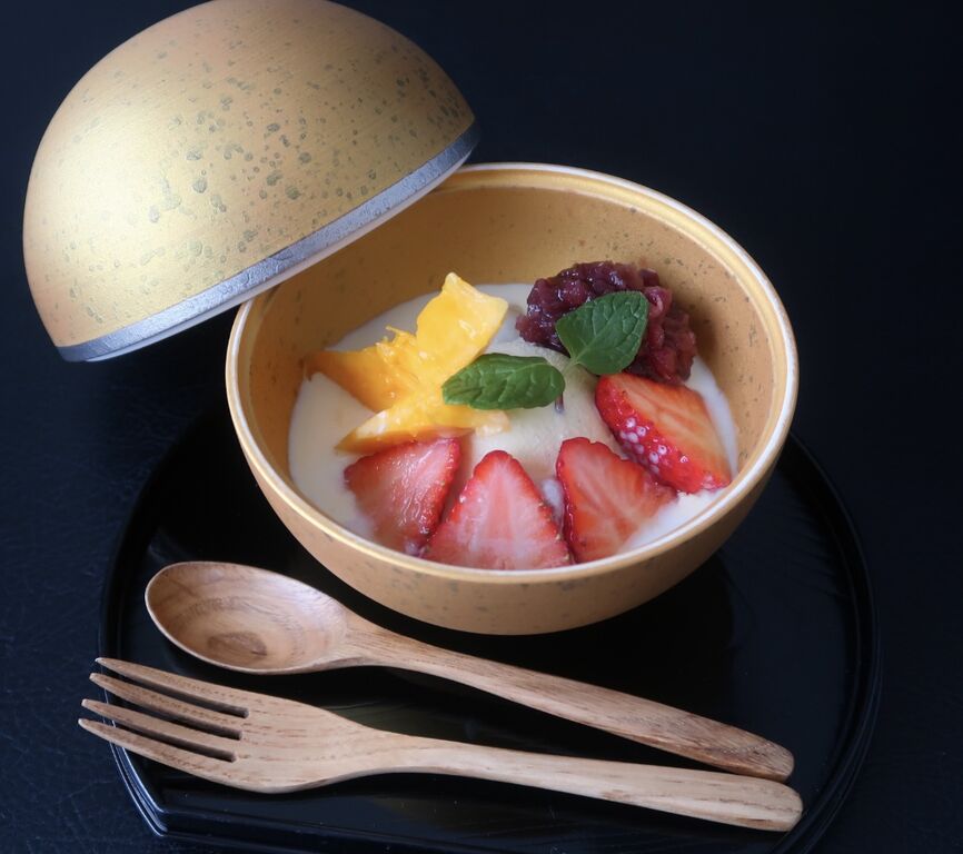 ふたつきの金色の器に、苺とパパイヤが華やか。