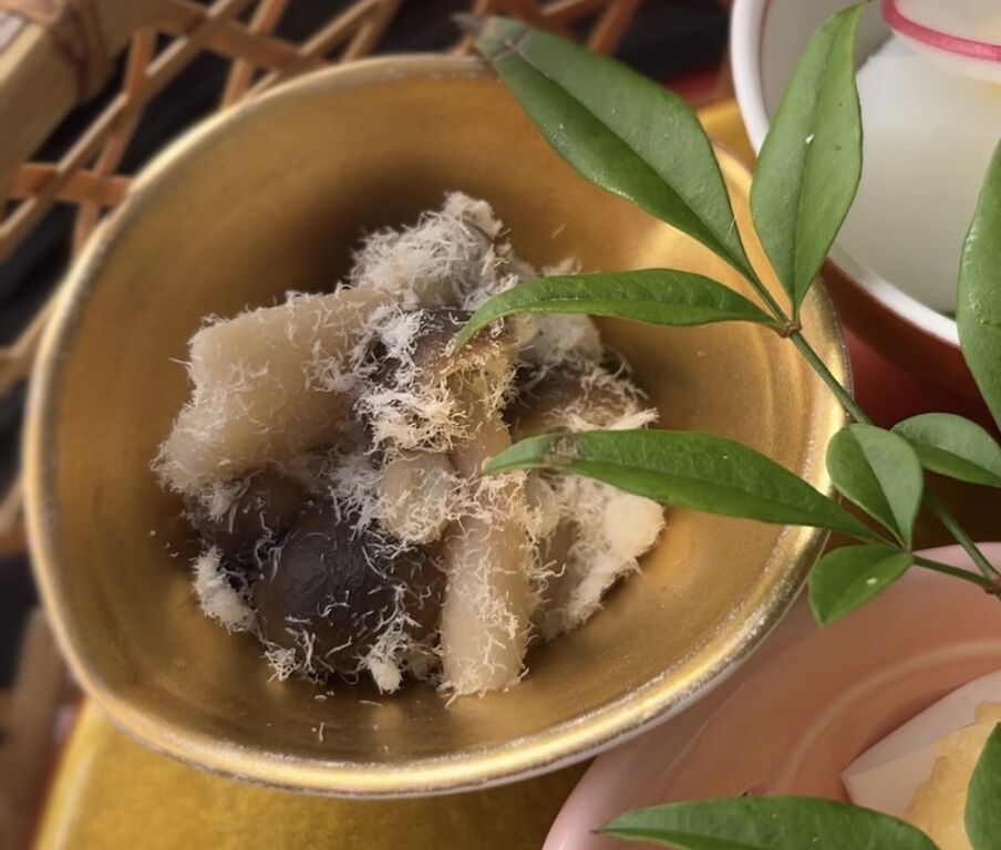 ふわふわとかけられた白身魚のでんぶのようなものからしめじが顔を出し、春の雪解けを思わせます。
