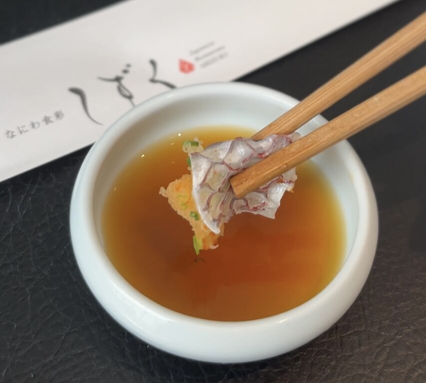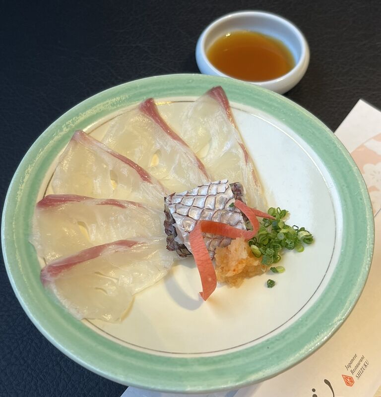 鯛の薄造りは、昆布のうまみをまとい、とても美味。