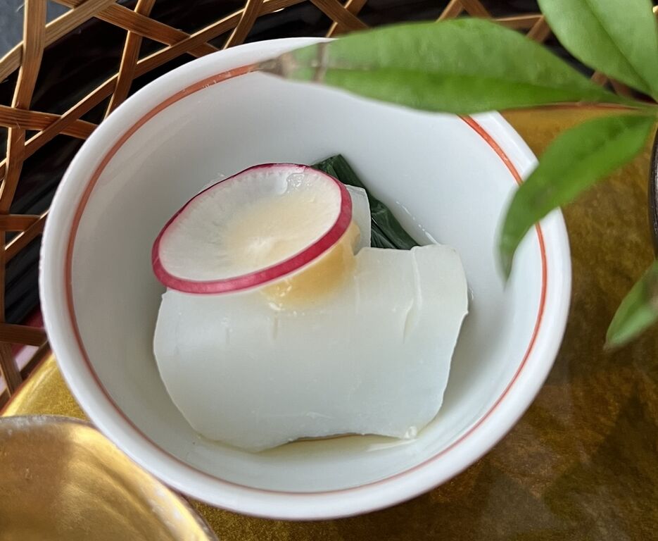 二十日大根をのせた、いかとわけぎの辛子酢味噌あえ。