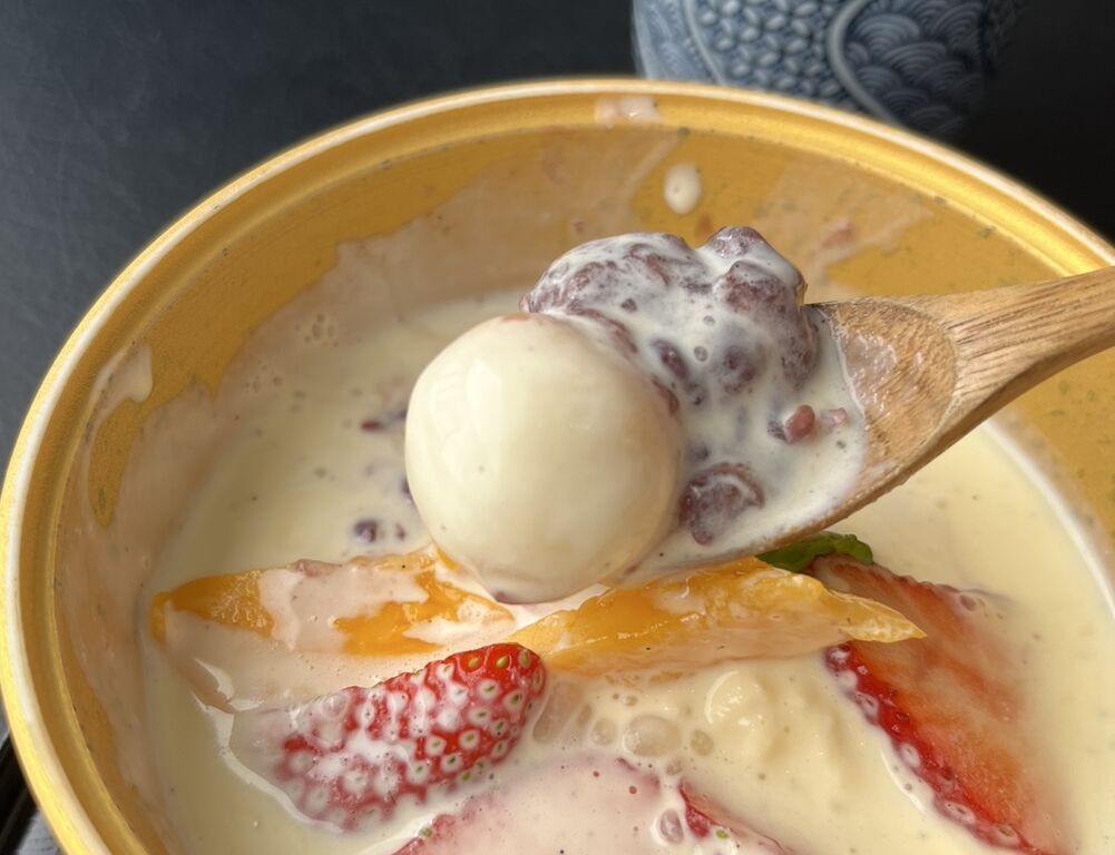 バニラビーンズ入りのバニラアイス、もっちりやわらかな白玉団子、小豆、ココナッツミルクと黒蜜。