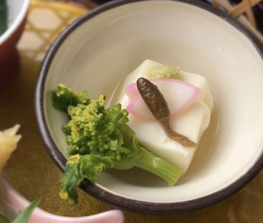 牛乳から作る峰岡豆腐には、菜の花、つくし、わさび。
