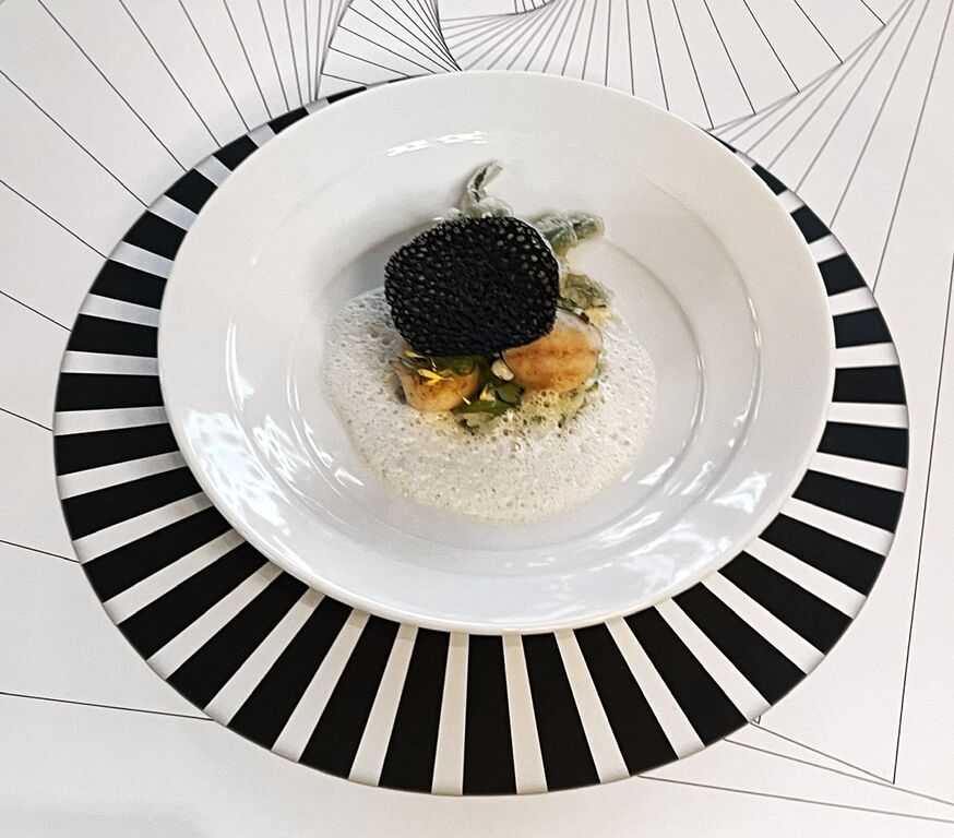 1ホタテ貝柱と舌平目のシャンパーニュ風味 チーズ入りリゾットと和ハーブの香り