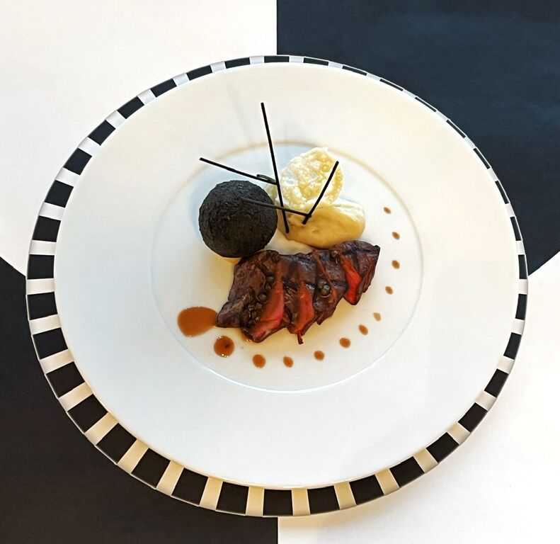牛ヒレ肉のグリルを参照入りの赤ワインソースで。じゃがいもにはパルメザンを合わせ、黒いコロッケは竹炭パン粉を使用。