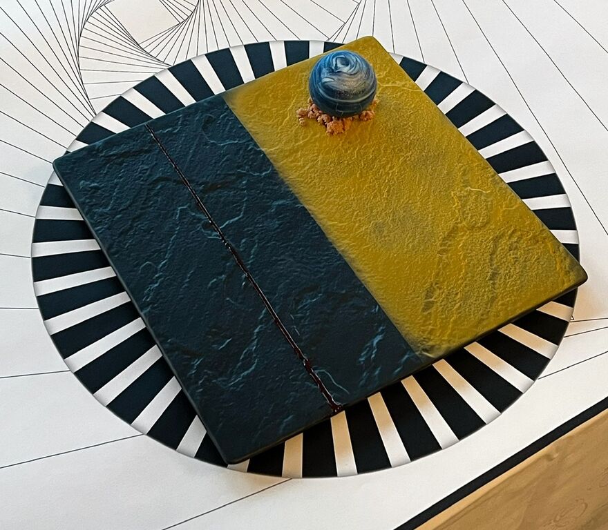 お皿に2色のチョコスプレーを合わせて吹き付け金色に。バニラムースをチョコレートでコーティングして地球を模しています。中には苺ソースが閉じ込められています。(マグマ?)