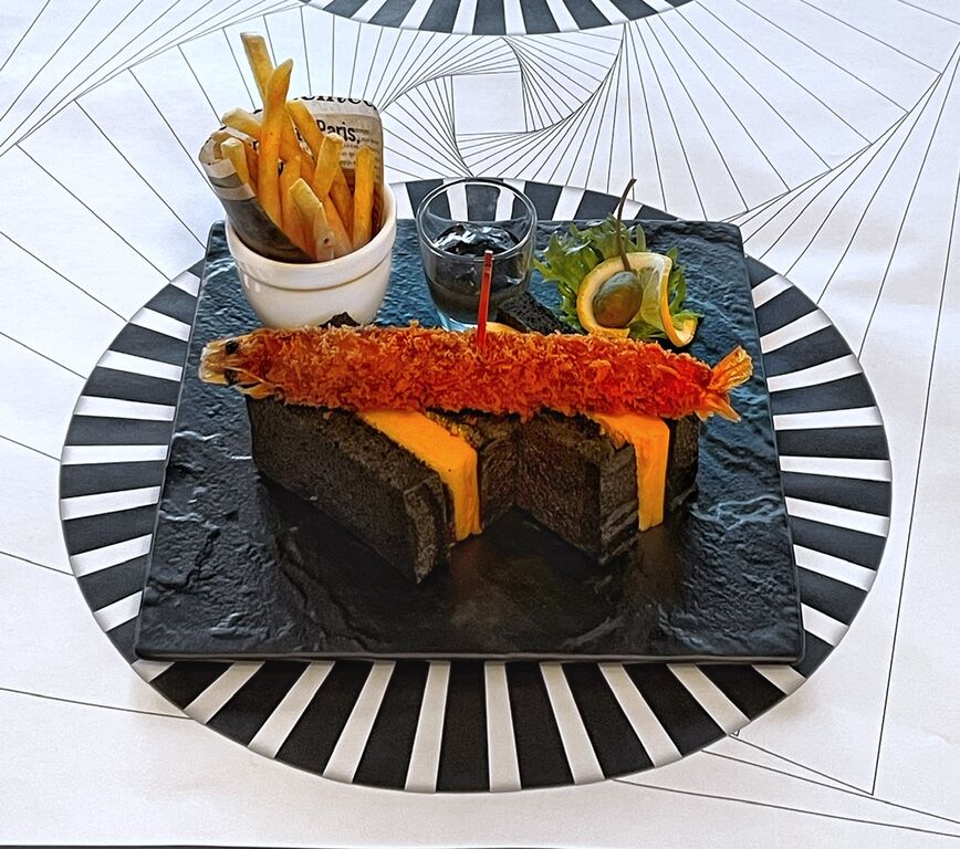 黒パンに厚焼き玉子をサンド。その上に大きな海老フライ。奈良漬けを入れた黒いタルタルソースで。