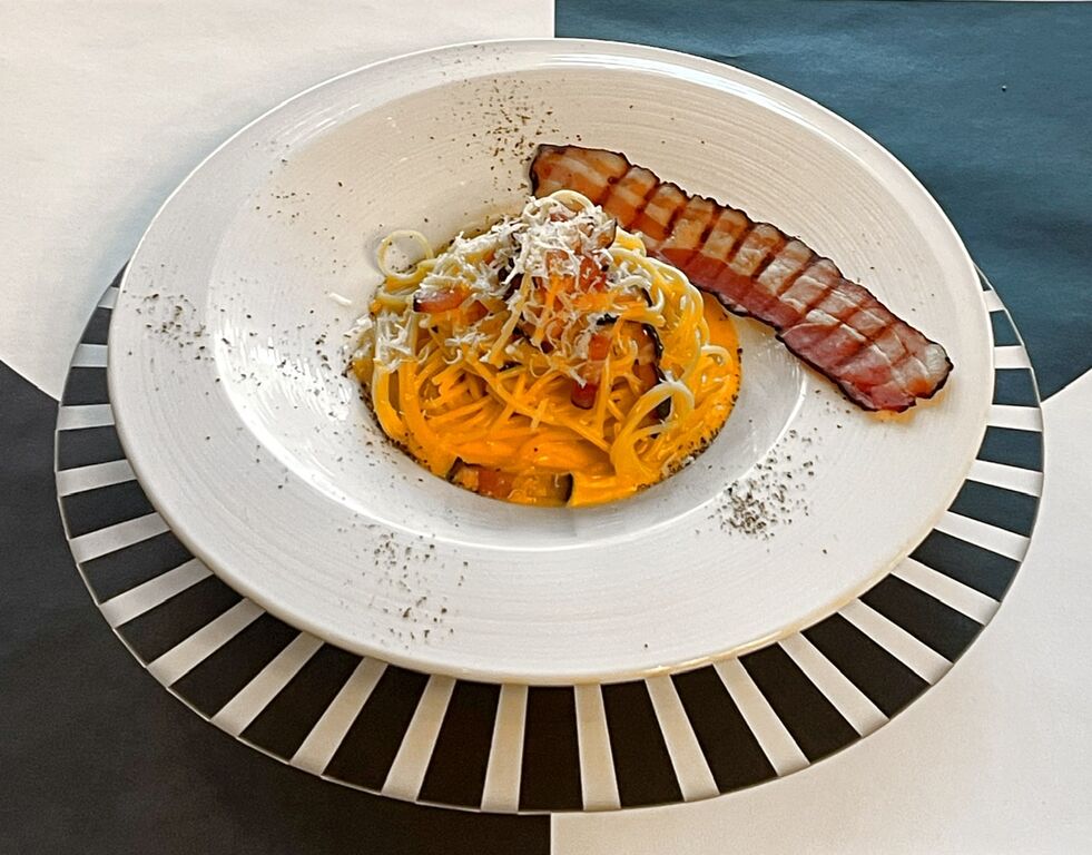 ベーコンを黒くカリカリに焼いたカルボナーラです。胡椒も黒。