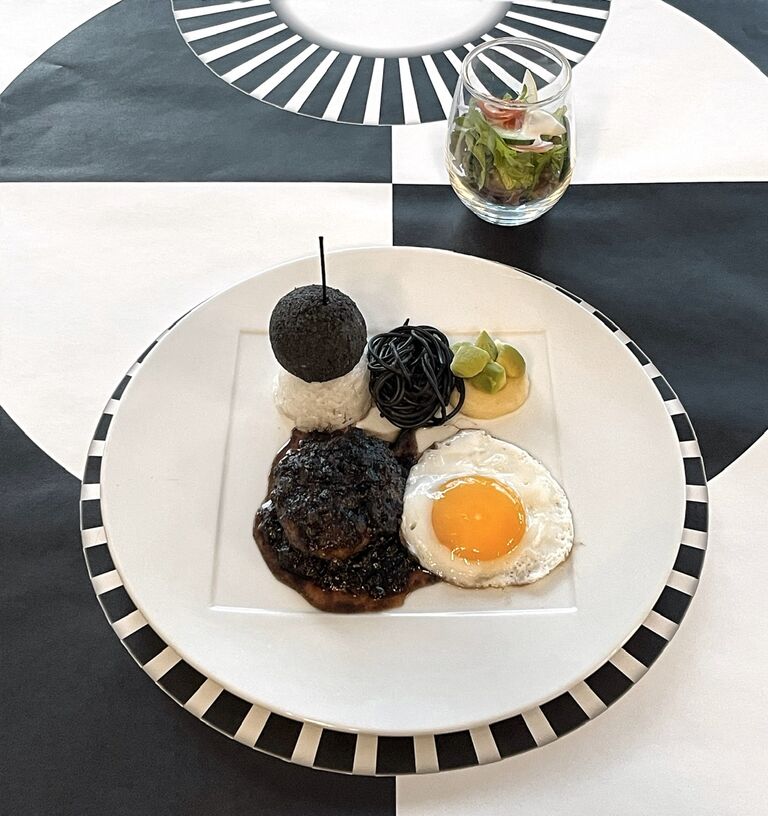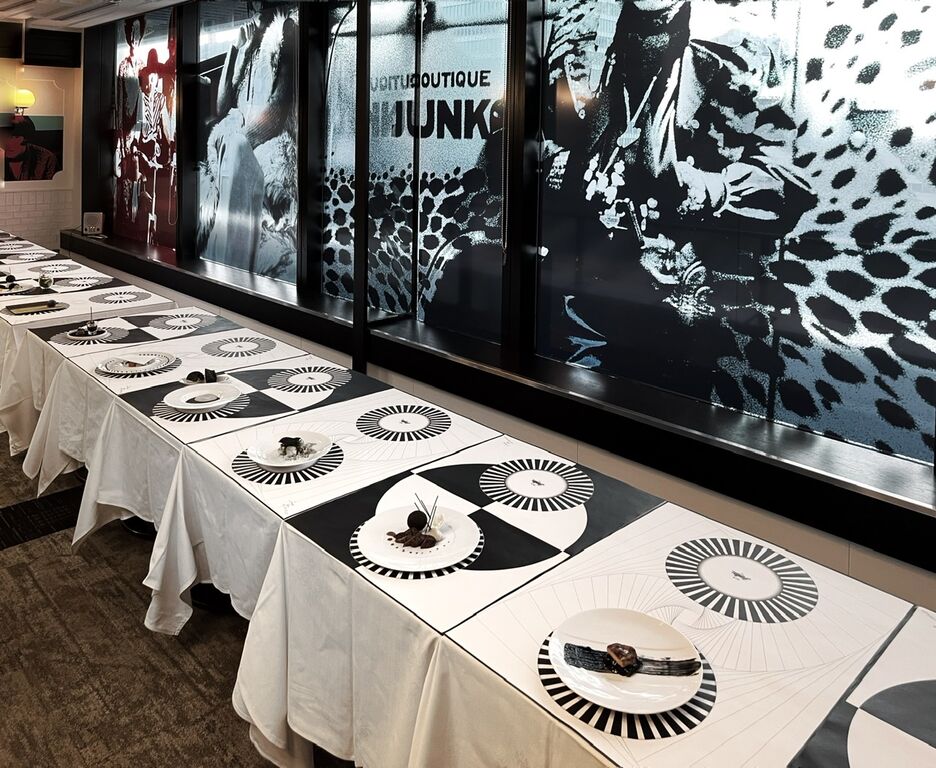 デザインコンセプトでもある“対極”は黒と白で表現され、テーブルクロスはすでに”お皿”が描かれたデザイン。