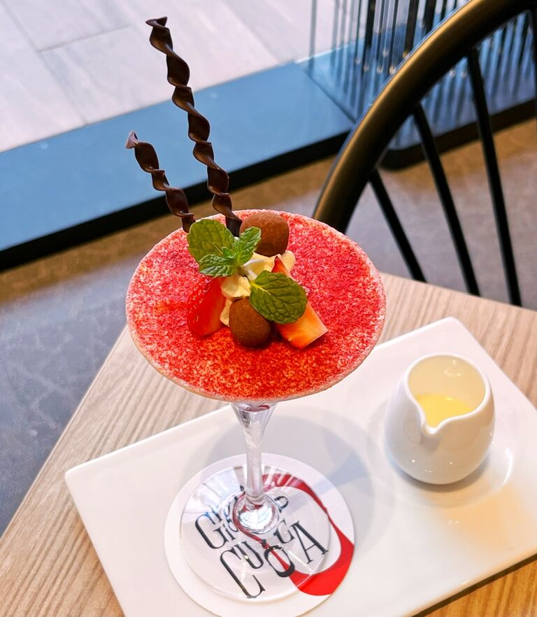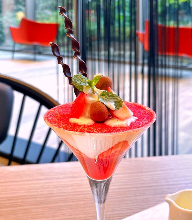 底には甘酸っぱい苺ゼリー。チョコ、苺、パフェのように楽しめました。
