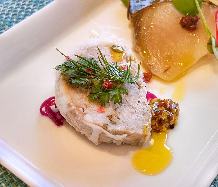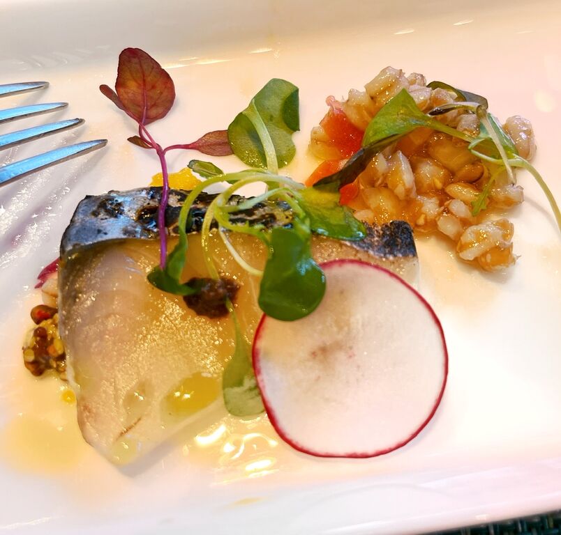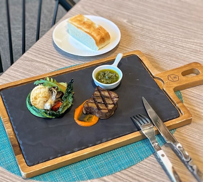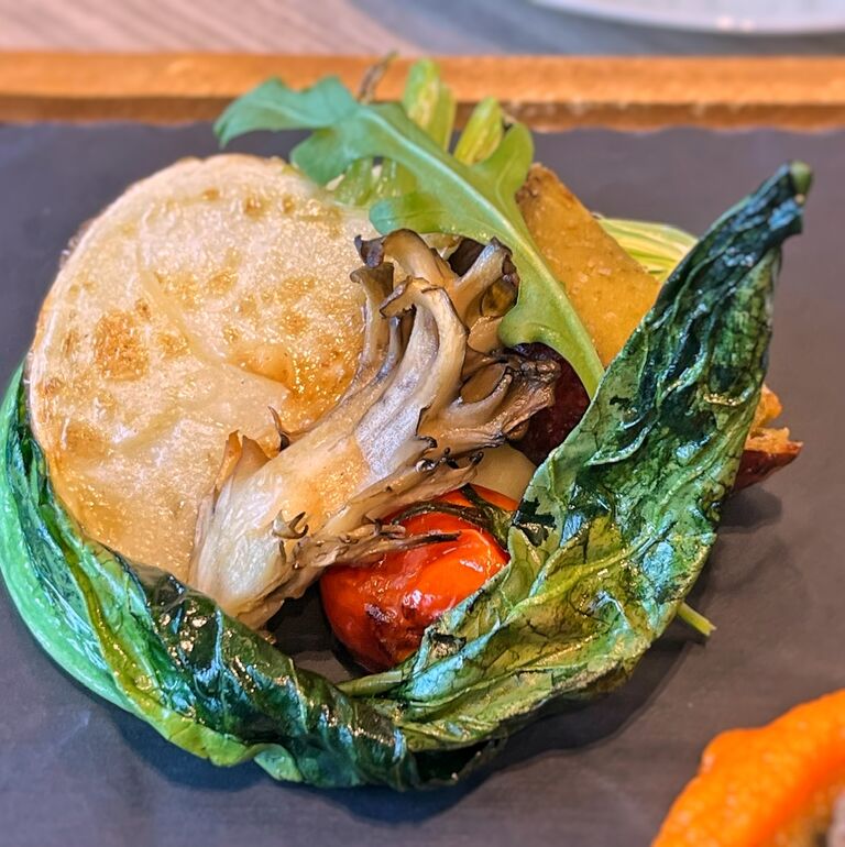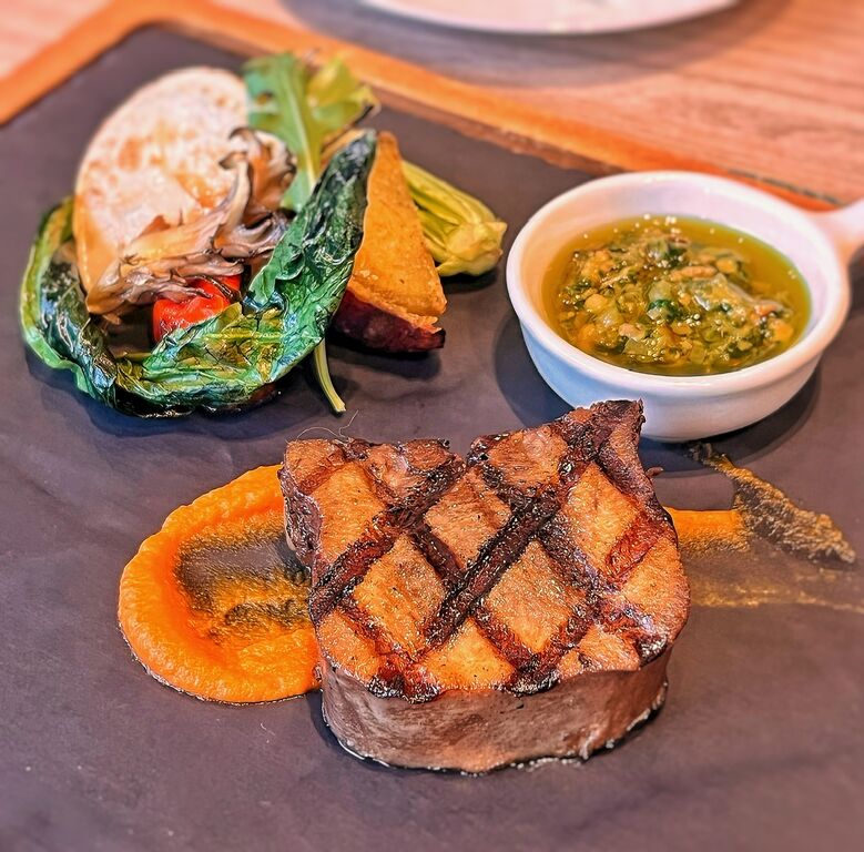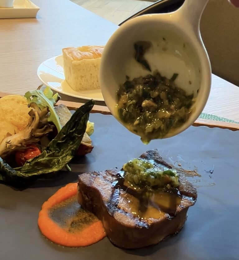 ●薪窯で仕上げた牛タンのグリル 山葵(わさび)のバニェット添え