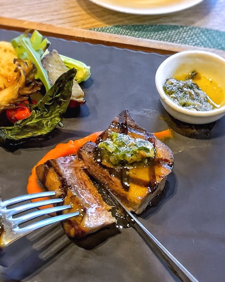 柔らかく煮込んだ牛タンを薪窯でグリルしたメイン。