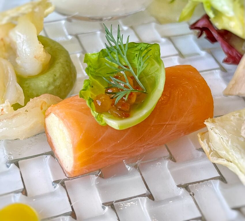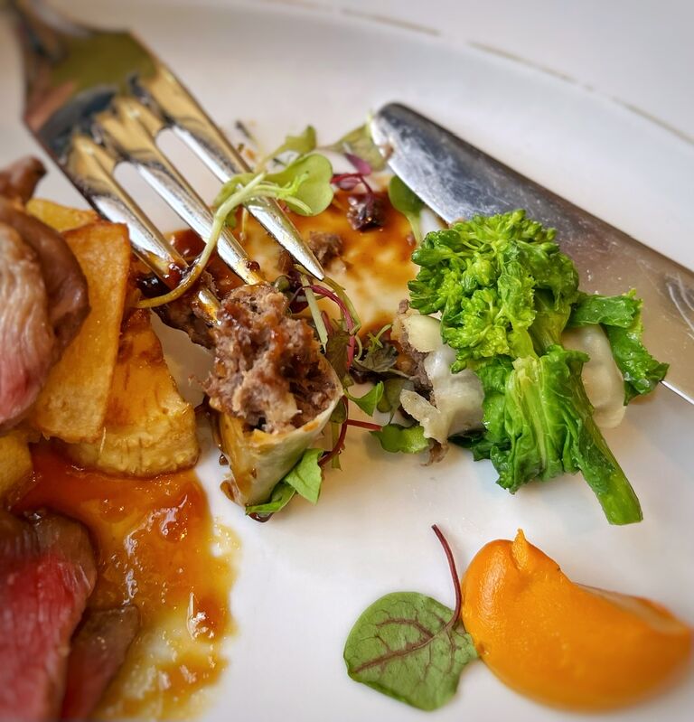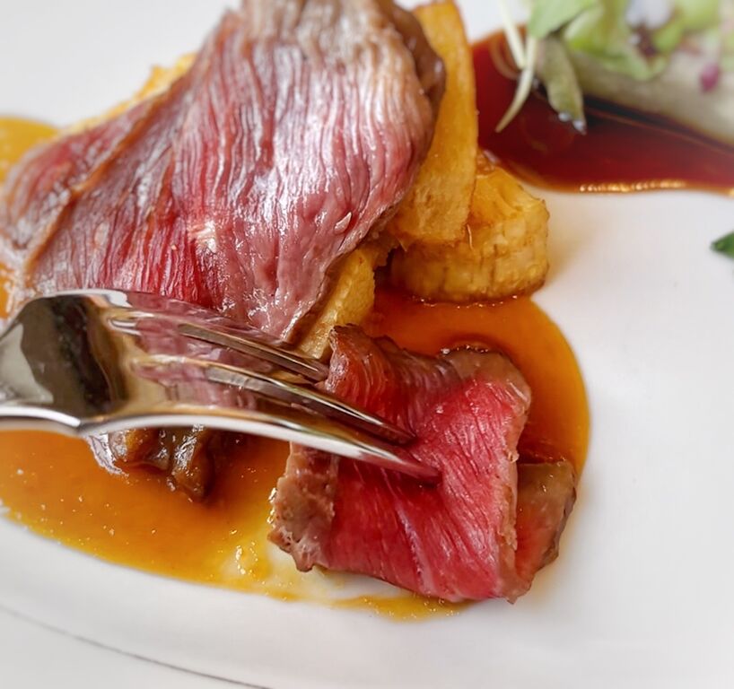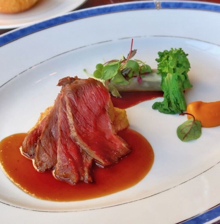 牛肉を、グリルで山葵入りの甘辛ソースと、パスタの詰め物にしたカネロニ風の2種で味わえるメインがホテル一推しメニューです❣️