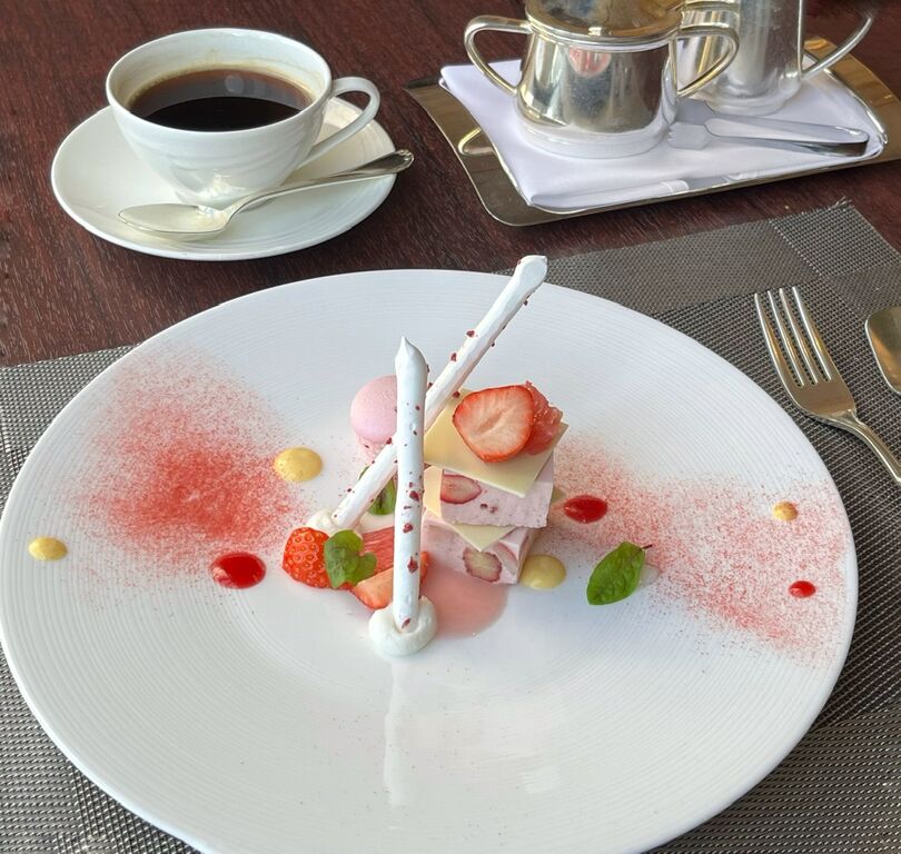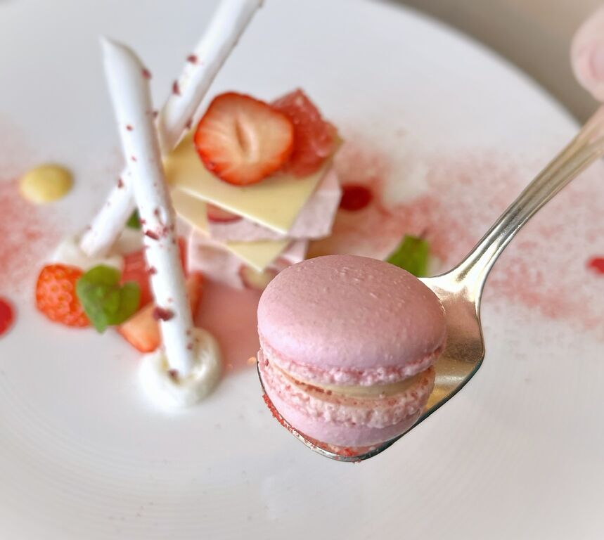 ホワイトチョコ、ピンクグレープフルーツ、いちご、ココナッツ風味のカスタードのようなソース。