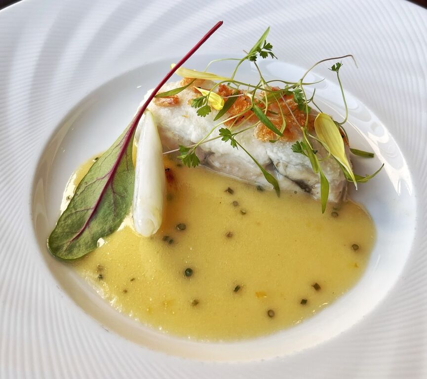 ■鰆の白ワイン蒸し 山芋と桜海老のクルート 柚子と浅葱風味のブールブランソース