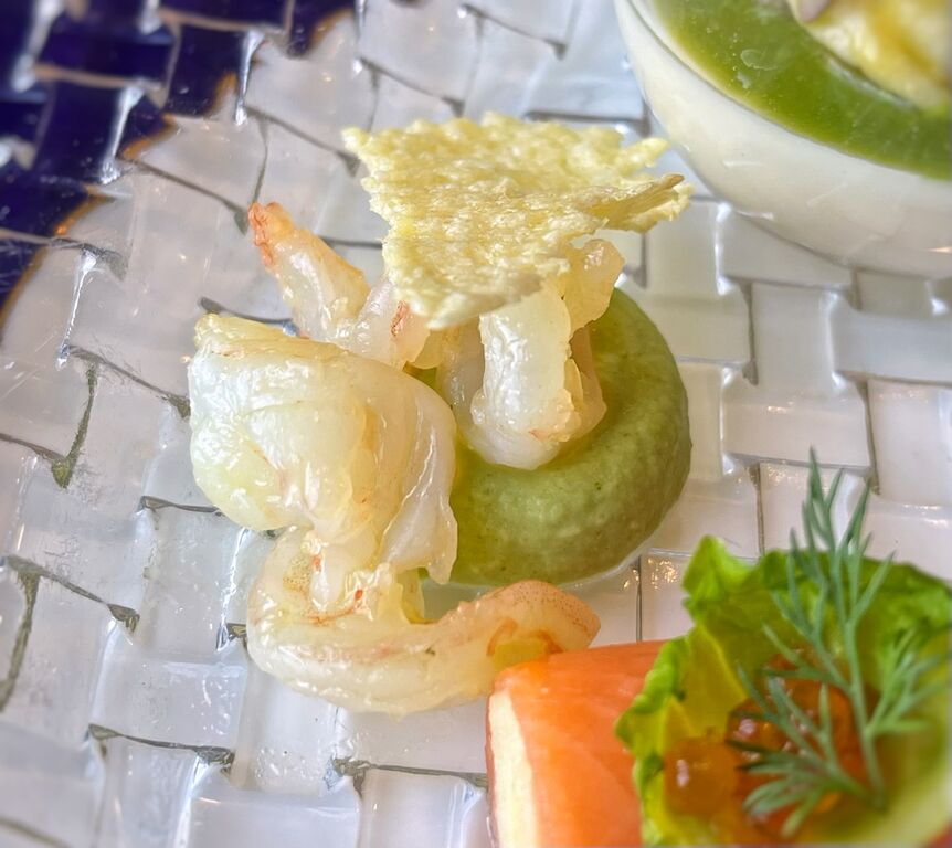 鰆の上に山芋のすりおろしがとろり。桜エビはサクサクと香ばしく、たっぷりのバターソースを絡めていただきました。スープで煮た蕪もおいしい。