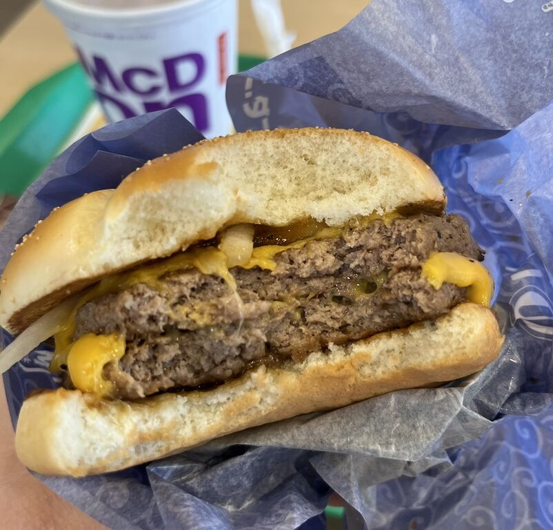 マックのパティは薄いから、いつもダブルバーガーを食べるの。