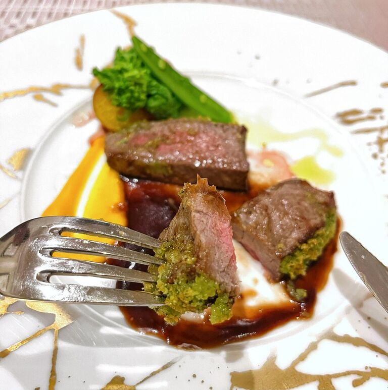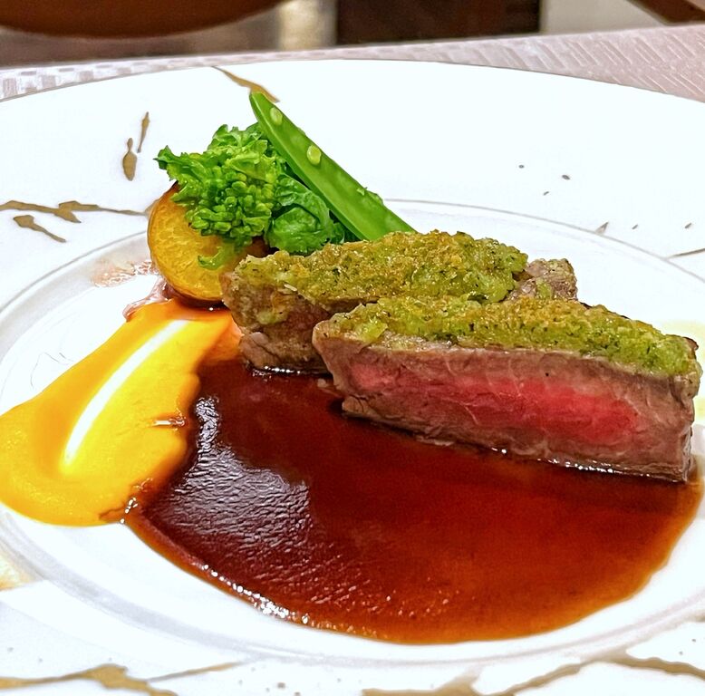 ハーブのクルートを纏(まと)った牛ロース肉のグラッセ