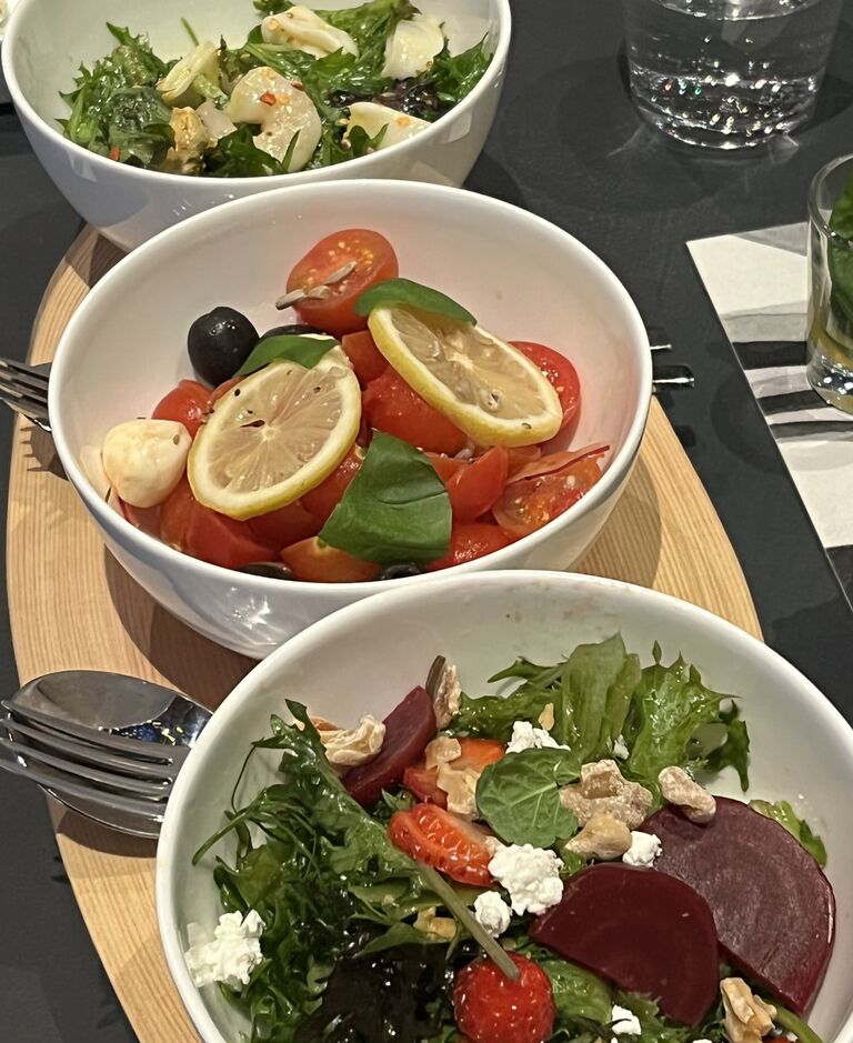 サラダは6種の中から収穫状況に応じて日替わりのようです。この日は「シーフードサラダ」と「チェリートマトのサラダ」と「イチゴとビーツのサラダ」。