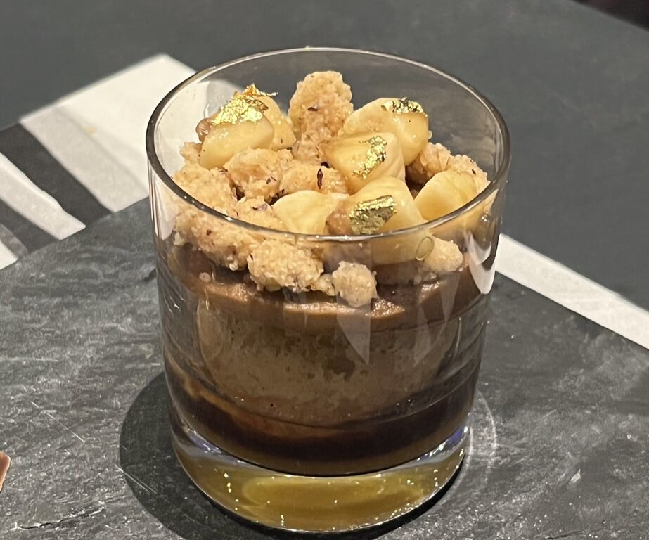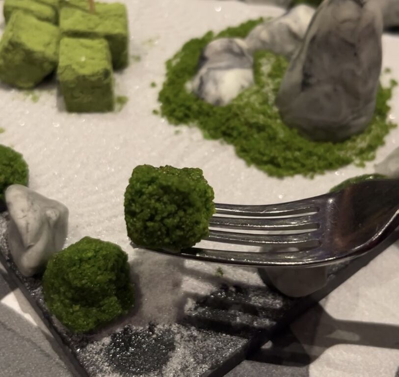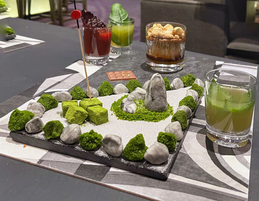 通常は、今月のデザート(ティラミス、チョコレートテリーヌ、イチゴミルフィーユの3種)から1種がえらべ、希望すればワゴンサービスでゲストも一緒にこのような庭園を造って楽しめるそうです。