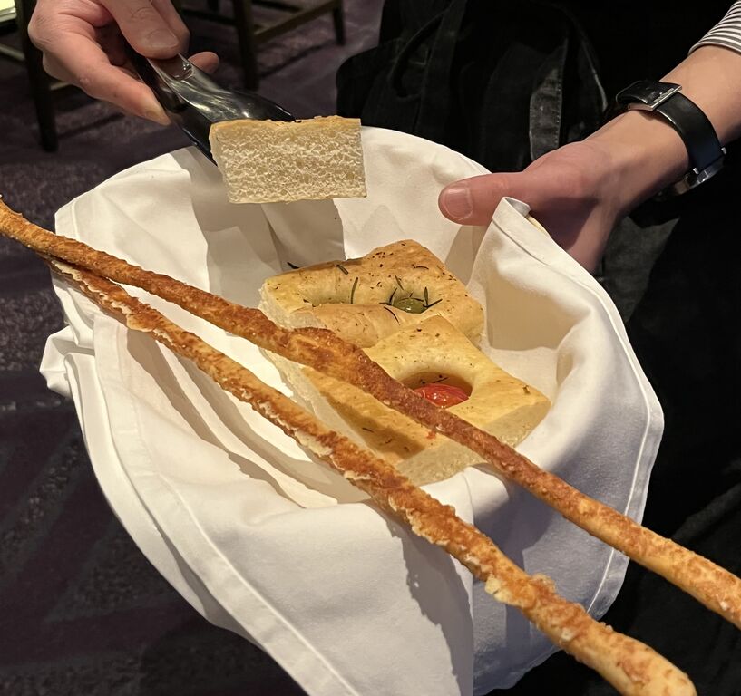 フォカッチャ(オリーブ&トマト)、グリッシーニ、2種類のバターを添えて