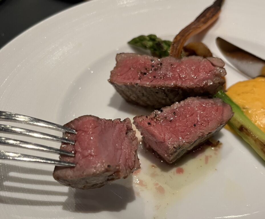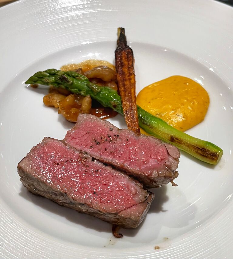 肉のうまみをかみしめて味わう赤身の牛肉とグリル野菜を、ハーブのソースをつけて、甘い栗の煮込みを合わせながらいただきました♪