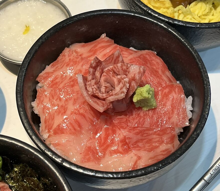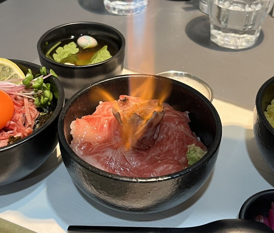 A5ランクの"和牛"リブロースをバラのように盛り付けてあり、バーナーで炙ると良い香りが漂いました〜😍