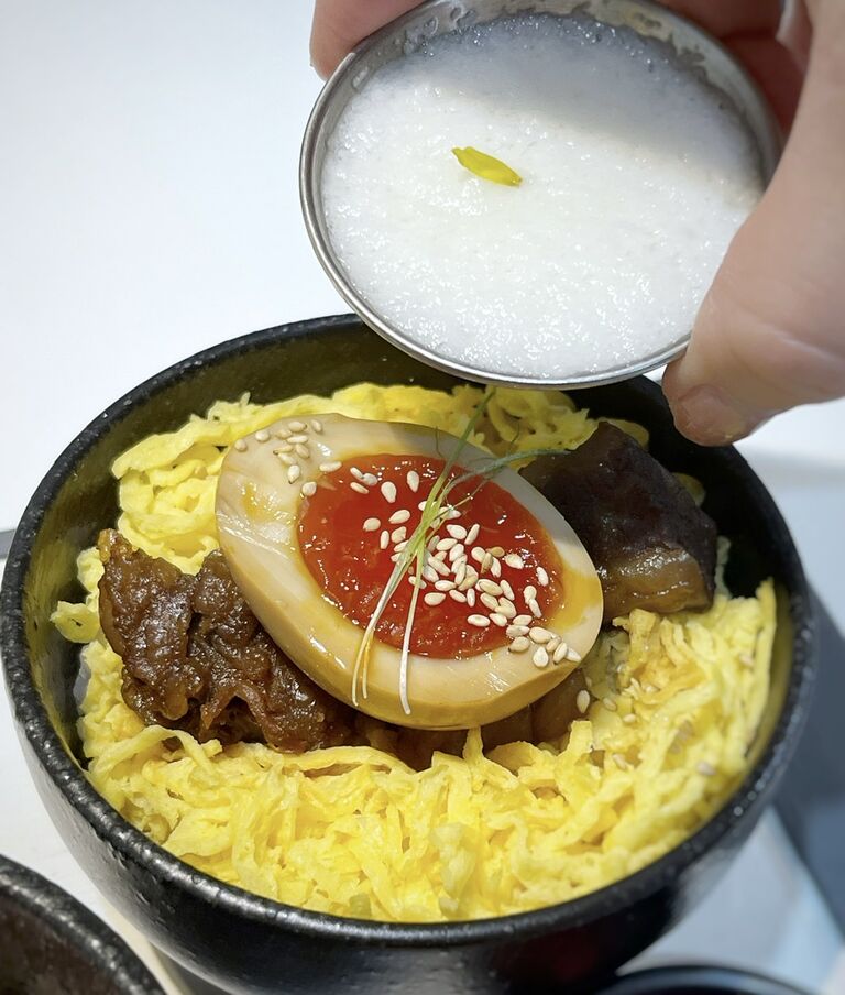 牛すじが甘辛く煮込まれていて、錦糸卵と味わった後、とろろをかけて。