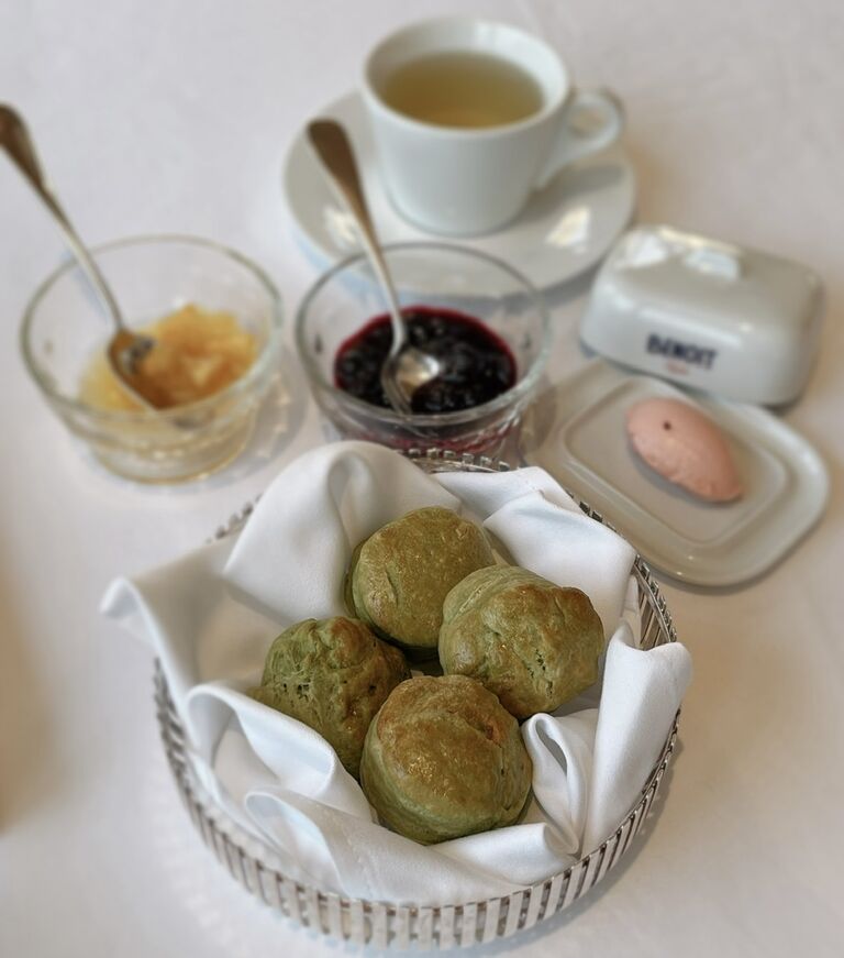 宇治抹茶のスコーン2個、ホイップバター、2種のジャム