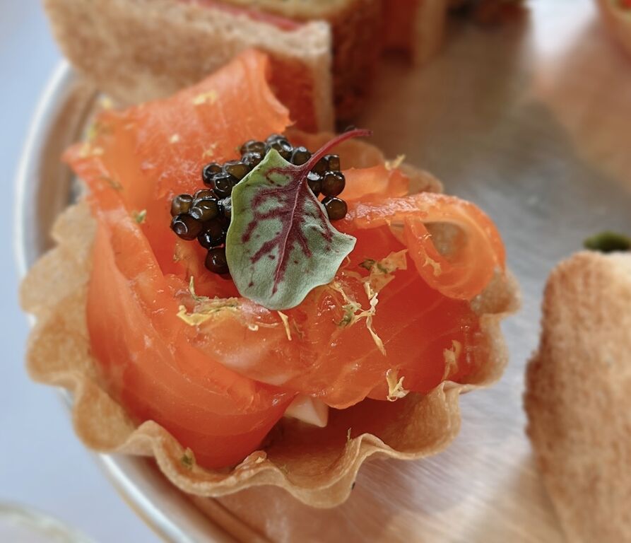 サクサクとクリスピーなカップに入ったサーモンはしっとりとしていて美味。豪華なキャビア添えです。