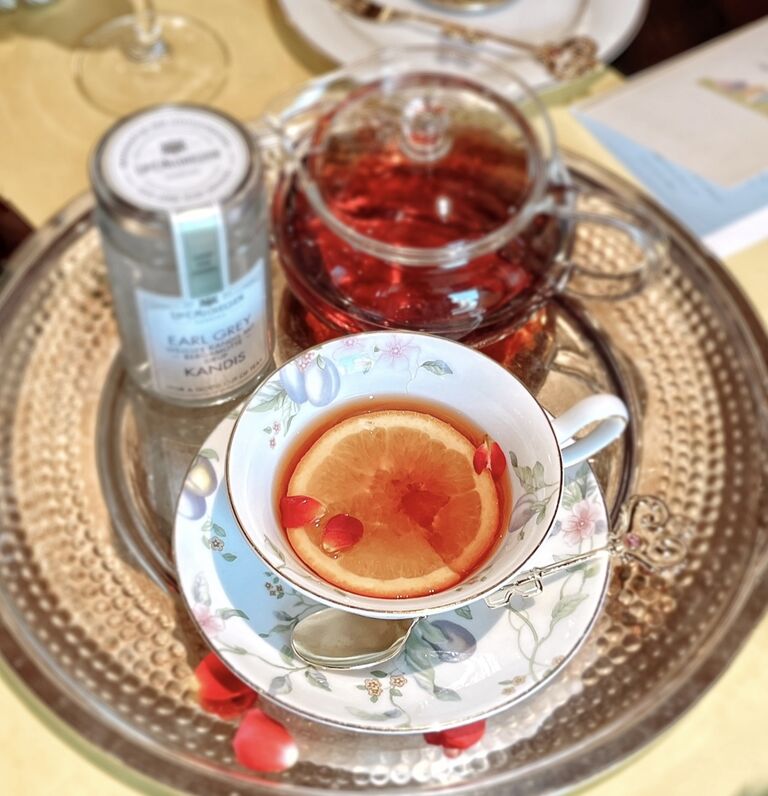 オレンジスライスと氷砂糖を浮かべたロンネフェルト「ダージリンサマーゴールド」に、ローズを散りばめたイギリス伝統紅茶の「シャリマティー」スタイル♪