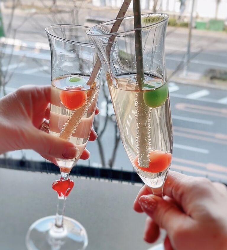 桃のシロップをソーダで割ったノンアルコールカクテルでカンパーイ❣️