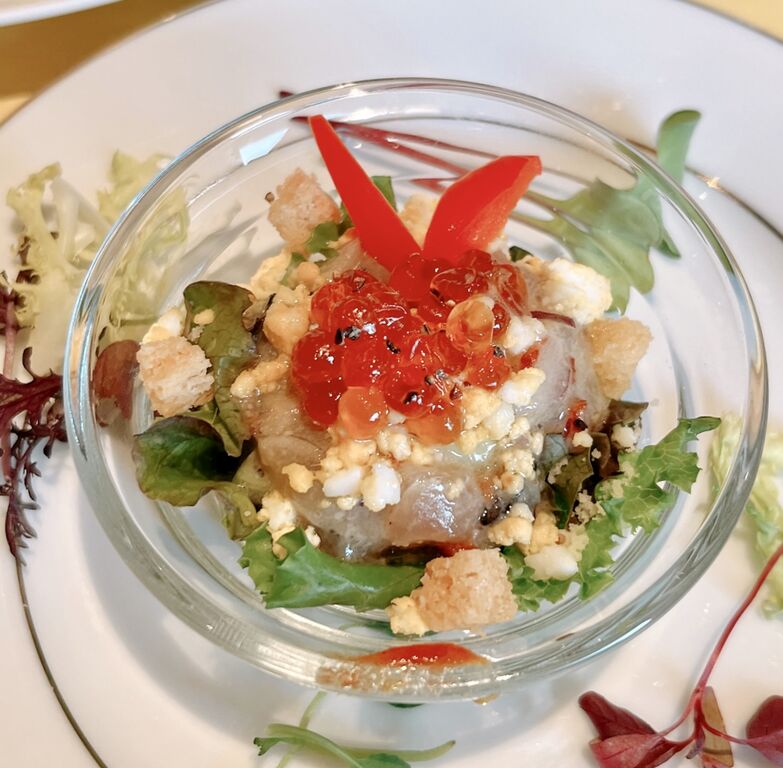 マグロを温泉卵と合わせることで、まるで甘海老のような味わいになるから不思議。いくらと卵をたっぷりのせたサラダ。