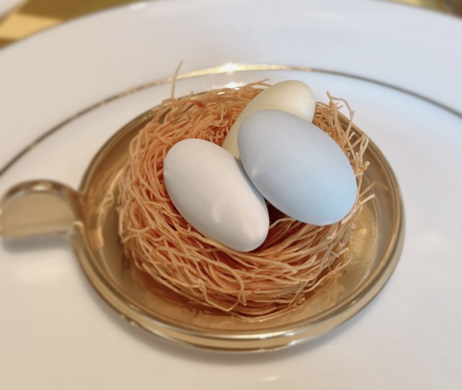 塩をアクセントにしたカダイフを鳥の巣に見立て、アーモンドの砂糖衣がけのドラジェを卵のように置いています。
