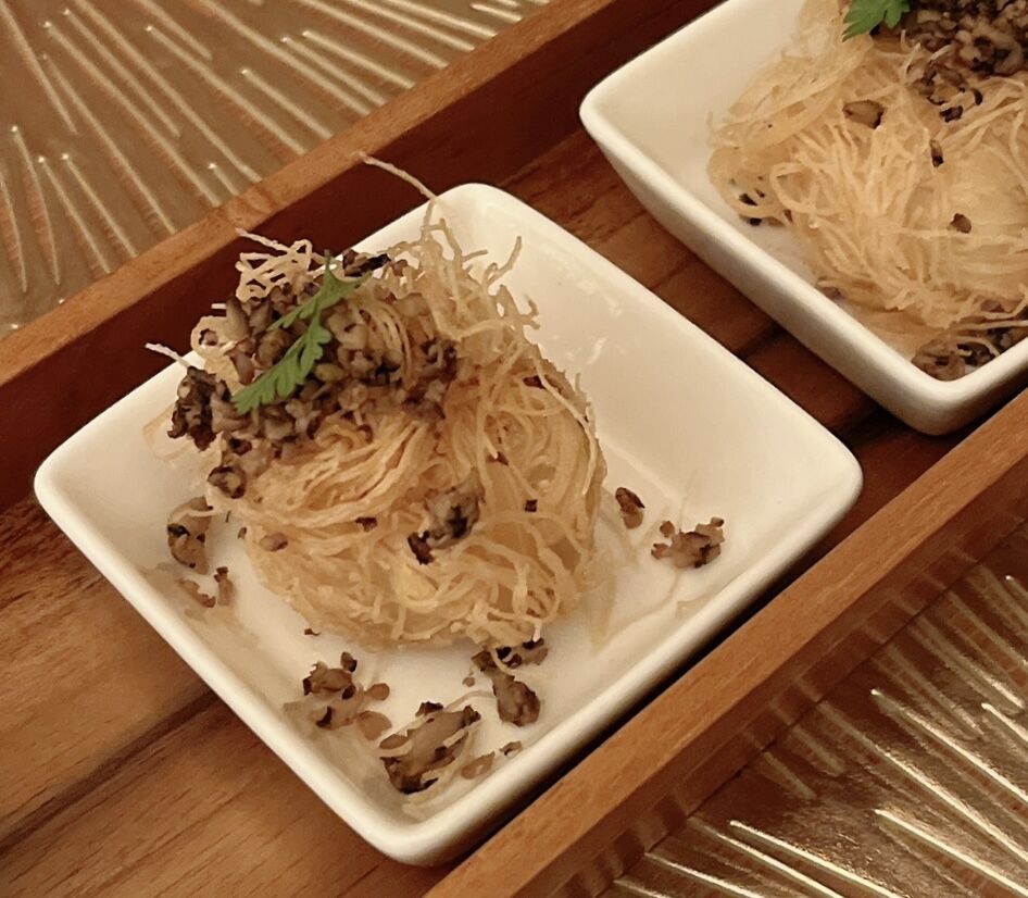 パリパリのカダイフ巻き。魚がホクホク。シイタケが細かく刻まれてまるでトリュフのよう。