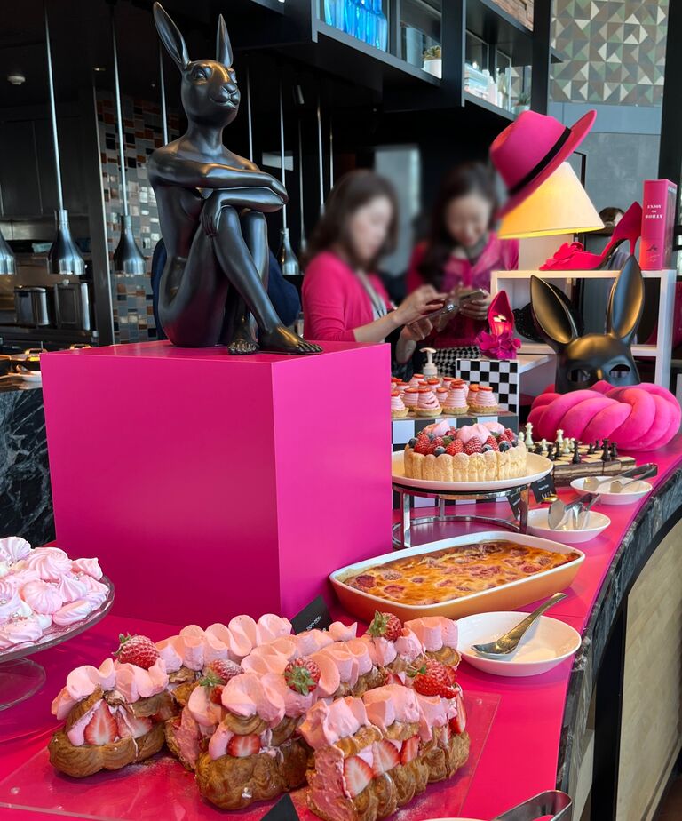 鮮やかなピンク色のビュッフェ台と白と黒で統一された空間に、ストロベリースイーツ約20種、セイボリー10種が華やかに並びます。