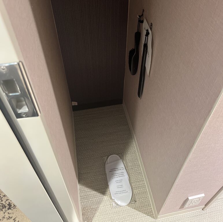 ドアを開けるとすぐハンガーコーナー。スリッパあった♪